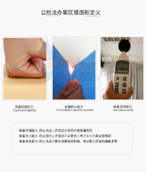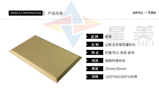 星美防撞墻板具有阻燃,吸音,隔音,防潮,防霉,防水,防油,防塵,防污,防靜電,防撞的功能。不易劃破,防撞率達(dá)99%,是派出所,拘留所,辦案區(qū)等場所裝修常用的防撞防火環(huán)保材料。
