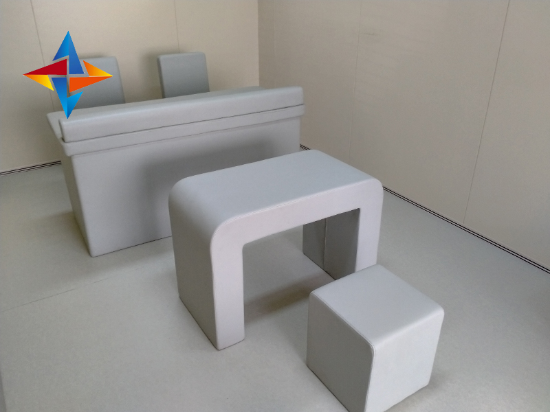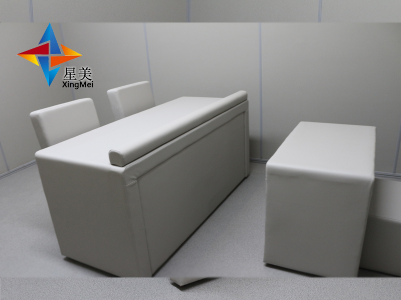 談話室軟包-防火防撞桌椅簽字桌子:尺寸為1000*450*680mm,顏色為黑色,黃色,灰色,由多層實(shí)木板+20mm厚的橡膠棉+1mm厚的小荔枝紋阻燃皮革組成,整體功能:防火防撞防火。