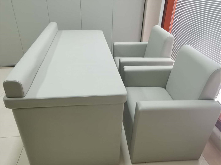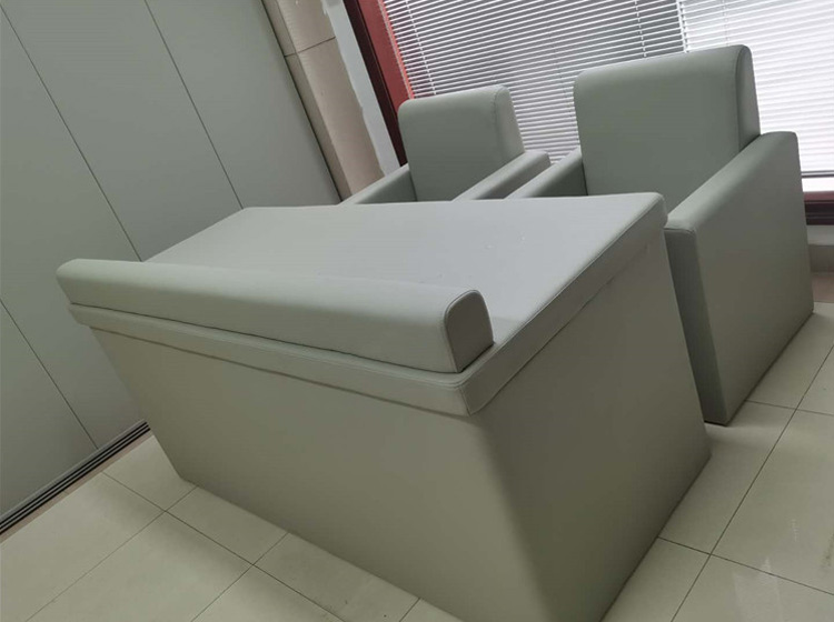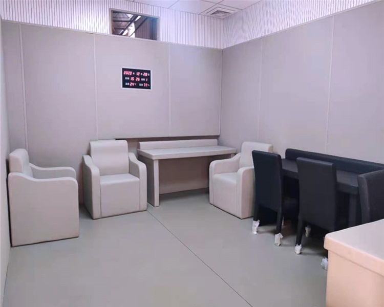 紀委審訊室防撞軟包墻面常用規(guī)格為1250*2450mm,防撞材料基材為無膠復合工藝的聚乙烯發(fā)泡棉,等級為B1級阻燃,E0級環(huán)保。墻面高于2.4米的部分采用阻燃吸音板,達到室內(nèi)錄音清晰的效果。