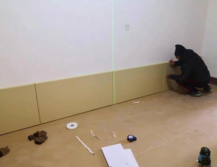 7、防撞門(mén)的安裝:將軟包裁剪成跟門(mén)相對(duì)應(yīng)尺寸,組裝門(mén)邊線,將門(mén)邊線裁剪好相應(yīng)尺寸,將軟包粘貼到門(mén)上面,用配套的門(mén)邊線收邊,在門(mén)的正反兩面安裝一個(gè)軟質(zhì)門(mén)拉手。