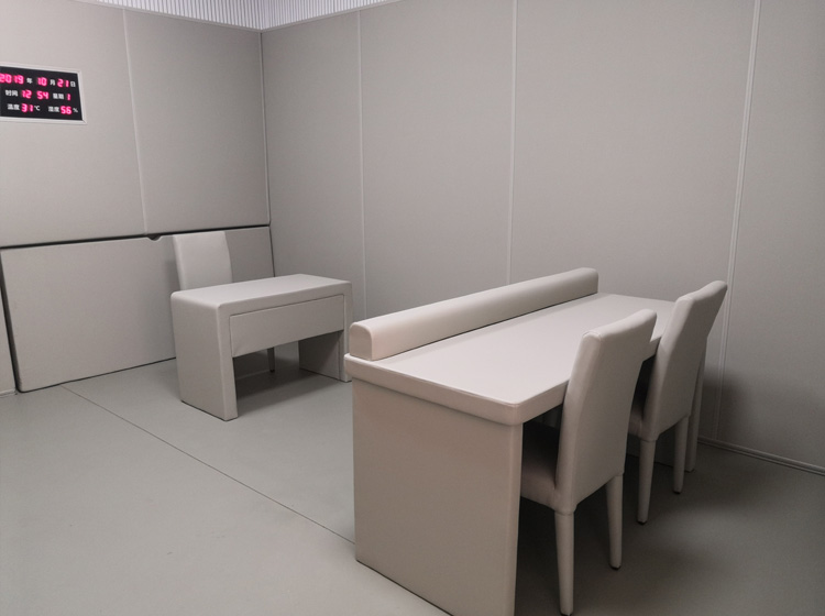 監(jiān)察委留置室防撞軟包墻面規(guī)范及建設(shè)標(biāo)準(zhǔn),其材料須是防撞行業(yè)前沿產(chǎn)品且具備防撞、阻燃、防水、環(huán)保、防潮、防撕拉摳扯,密度高且比厚度較低,同比2-3倍厚度的海綿壓縮后同等密度,實現(xiàn)2.5/2公分厚度的高密度防撞棉的防撞效果與10公分海綿的防撞性能同等甚至更佳。同時富有彈性、復(fù)原性,而且易切割、施工簡便,新型環(huán)保納米棉皮革軟包是由高分子材料聚合而成,用皮革做面飾,皮革防水耐刮,后背阻燃鋁箔。一般標(biāo)準(zhǔn)規(guī)格為1250*2450mm,一般紀(jì)檢委墻面防撞軟包厚度做20mm,25mm。