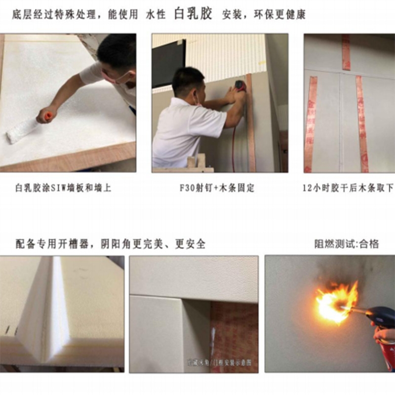 3、在軟包背面刷膠水(白乳膠、環(huán)保噴膠都可以),然后粘貼到木工板上面。軟包材料大小可以在現(xiàn)場用美工刀等工具來進行切割修改,收邊條亦是如此,方便施工現(xiàn)場修改尺寸。